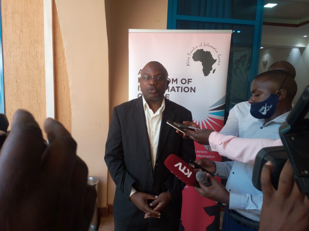The Executive Director Africa Freedom and Information Centre Gilbert Sendugwa addressing journalist at the launch of the report to the Media