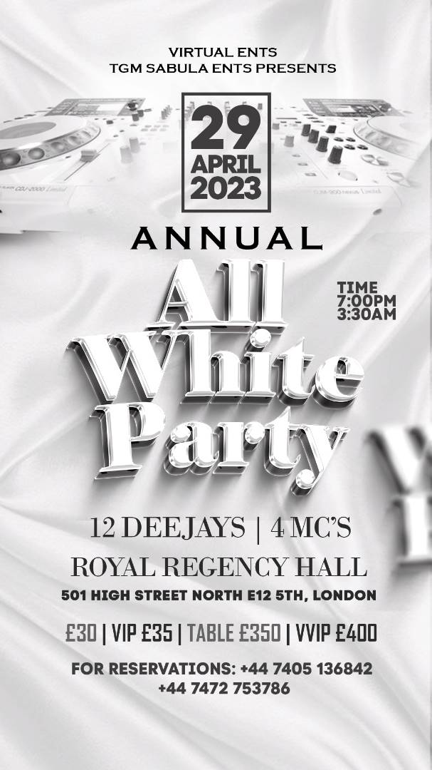 Dj Mac Pro alias Vincent Kimera is set to headline the annual United Kingdom all white party at Royal Regency hall on the 29 April 2023.