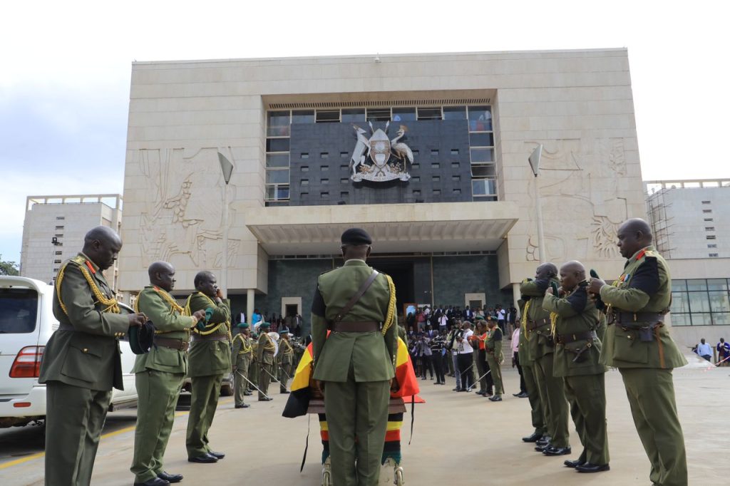 The Speaker, together with Members of Parliament, Parliament staff, relatives and friends of the deceased received the casket containing the remains of the former minister, which was ushered in by the UPDF.