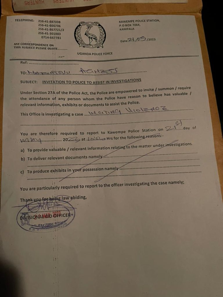 Police summoned Namatovu on the 21st may 2023 and she appeared there on the same date at the CID department of Kawempe police station where she was interrogated over matters of inciting violence.