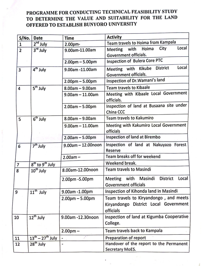 The main activities that will be carried out will include mobilization and sensitization of local leaders, confirm area of and ownership, opening of boundaries of land with titles, make survey of land, establish the feasibility and evaluation of land/assets, suitability of land for the university and preparation of a report by the team from the ministry of lands.