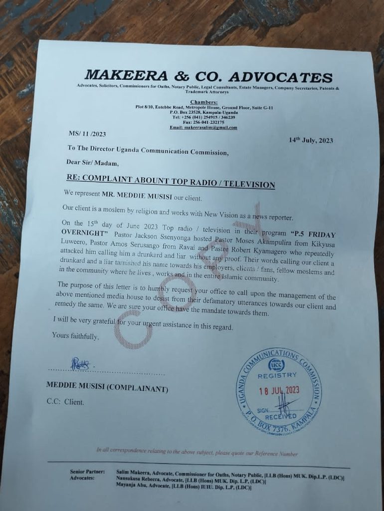 Kampala bound journalist and business man Meddie Musisi has petitioned Uganda communication commission (UCC) to cause Top Television and Top radio to stop running false utterances allegedly defaming his person.