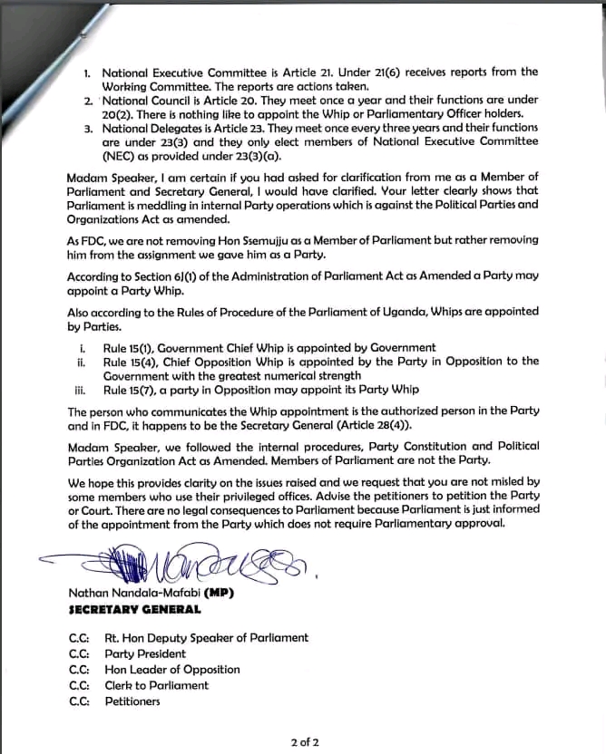 In a letter dated 17th, August, 2023, signed by the party Secretary General Hon. Nathan Nandala Mafabi in response to the speaker of parliament Rt. Hon. Annita Among letter declining to effect the changes, the party stated that the FDC cabinet which is the party’s working committee of the National Executive Committee (NEC) under article 22 sitting of 195th which sat on Monday, 7th, August, 2023 under min: 3,07082023 took a decision to replace Ssemujju with hon. Nsibambi just like it appointed the former in its sitting of  169th  which sat on Wednesday, 26th, May, 2021, Min: 2,26052021.