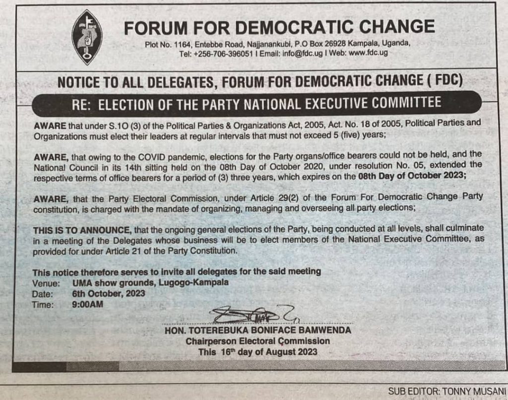 According to the notice issued in the Friday Daily Monitor newspaper signed on the 16th, August, 2023 by the party Chairperson, Electoral Commission Hon. Toterebuka Boniface Bamwenda, the delegates will convene at UMA show grounds, Lugogo – Kampala on 9th, October, 2023 where they will hold the elections from.