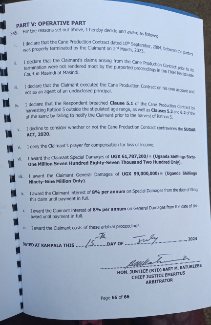 According to Mabirizi, Haji Kazimbiraine Mahmoud entered into a contract with Kinyara Sugar Company limited for sugar cane growing, however he experienced a lot of inconsistencies and breaches with regards to how Kinyara Sugar Company Limited was treating him which prompted them to seek for legal justice. According to the ruling, Kinyara Sugar Company limited is directed to pay 61million Uganda shillings as special damages and 99 million Uganda Shillings as general damages to Haji Kazimbiraine Mahmoud, and 8% of interest annually for both special the damages from the date of these awards until payments are full.