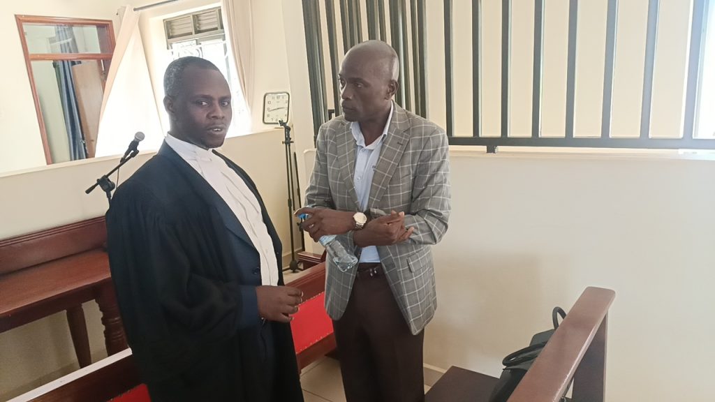 Muhangi George lawyer for Maj Mark Wanyama discussing with him inside the court.