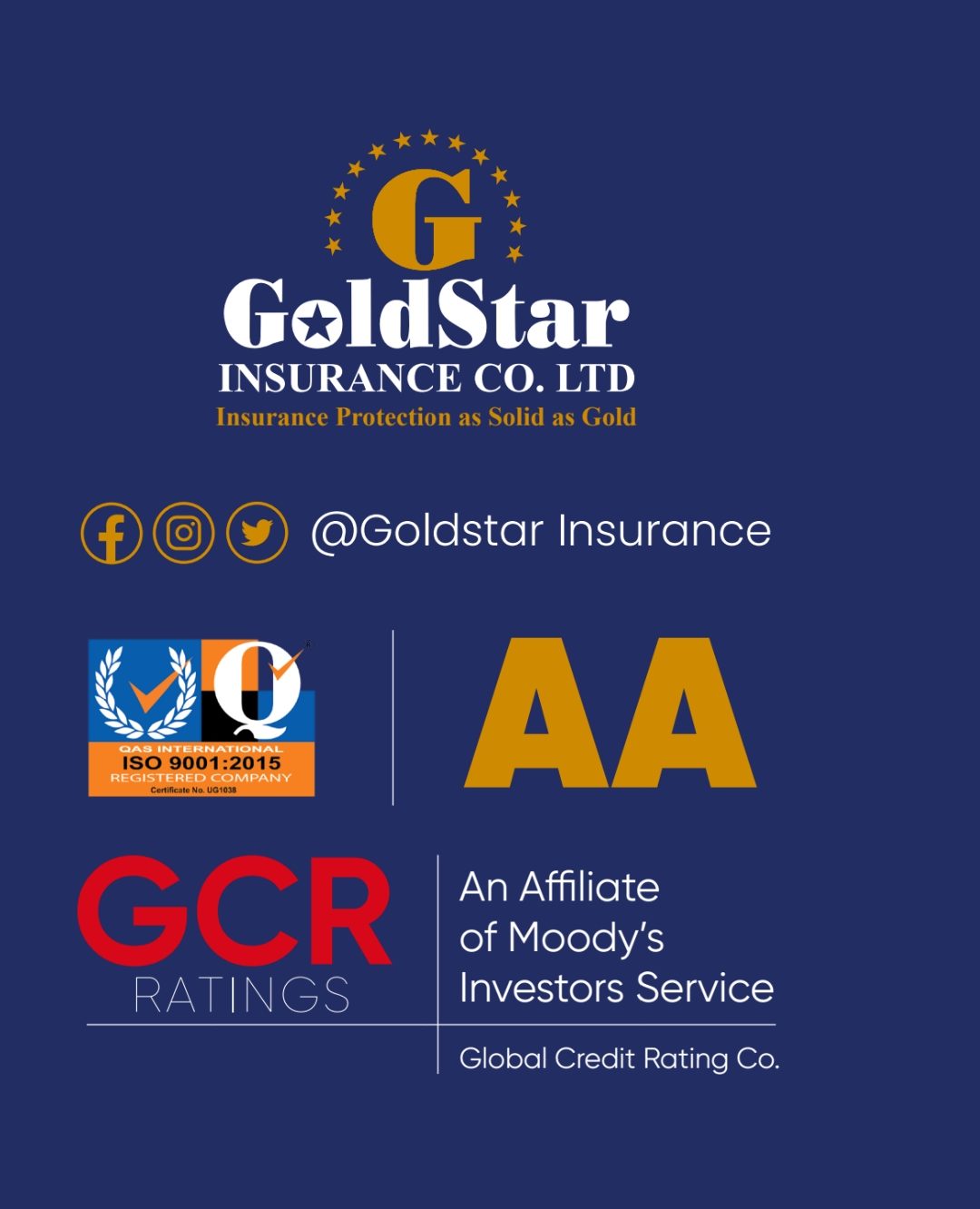 Goldstar Insurance Company Limited is pleased to announce the affirmation of its AA (UG) national scale financial strength rating by GCR Ratings, with a Stable Outlook. This rating signifies a strong endorsement of Goldstar’s solid financial foundation and prudent management practices.