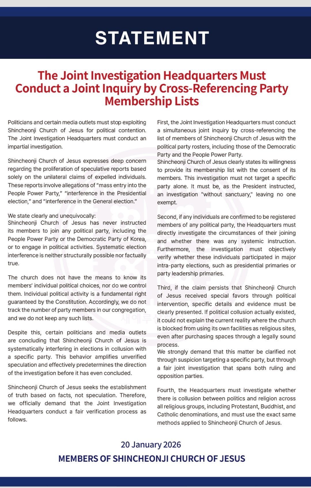 Politicians and certain media outlets must stop exploiting Shincheonji Church of Jesus for political contention. The Joint Investigation Headquarters must conduct an impartial investigation.