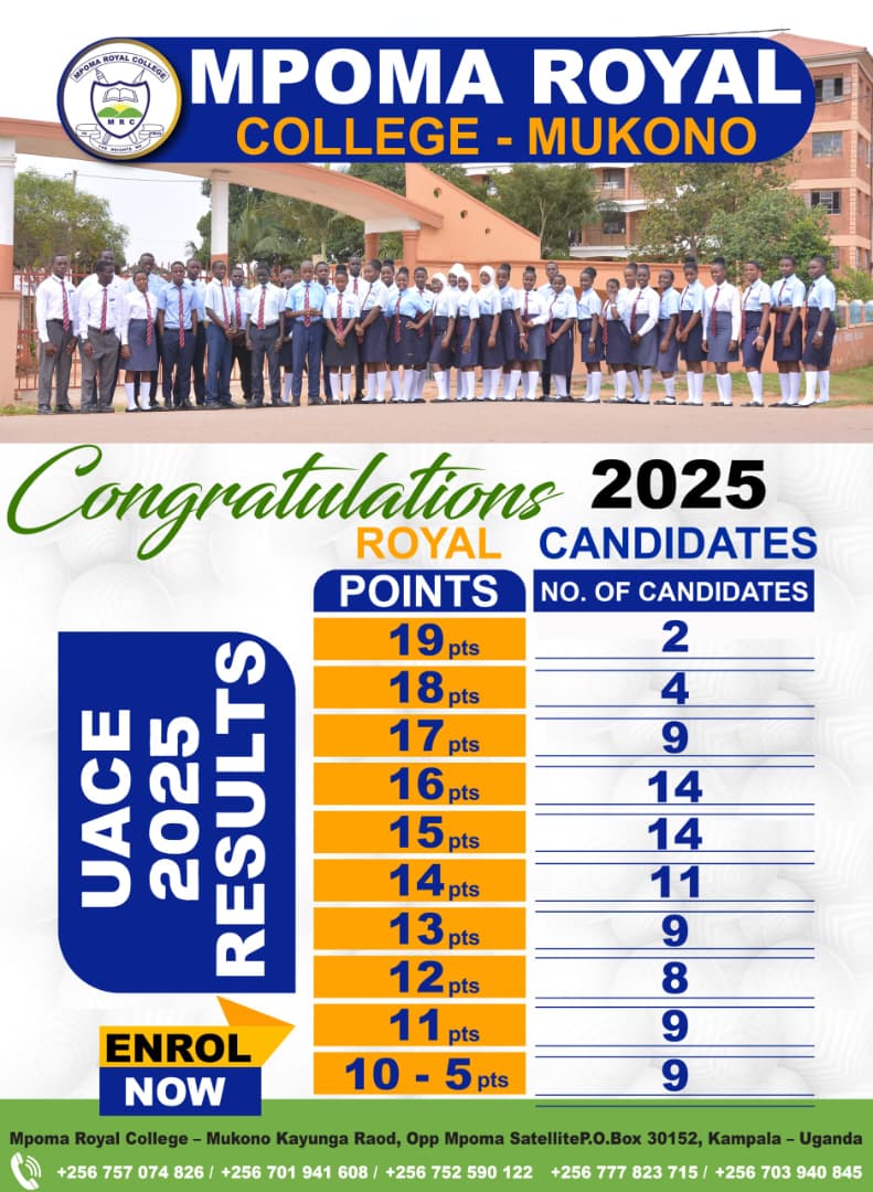 Mpoma Royal College in Mukono has once again demonstrated academic excellence after posting impressive results in the 2025 Uganda Advanced Certificate of Education (UACE) examinations.